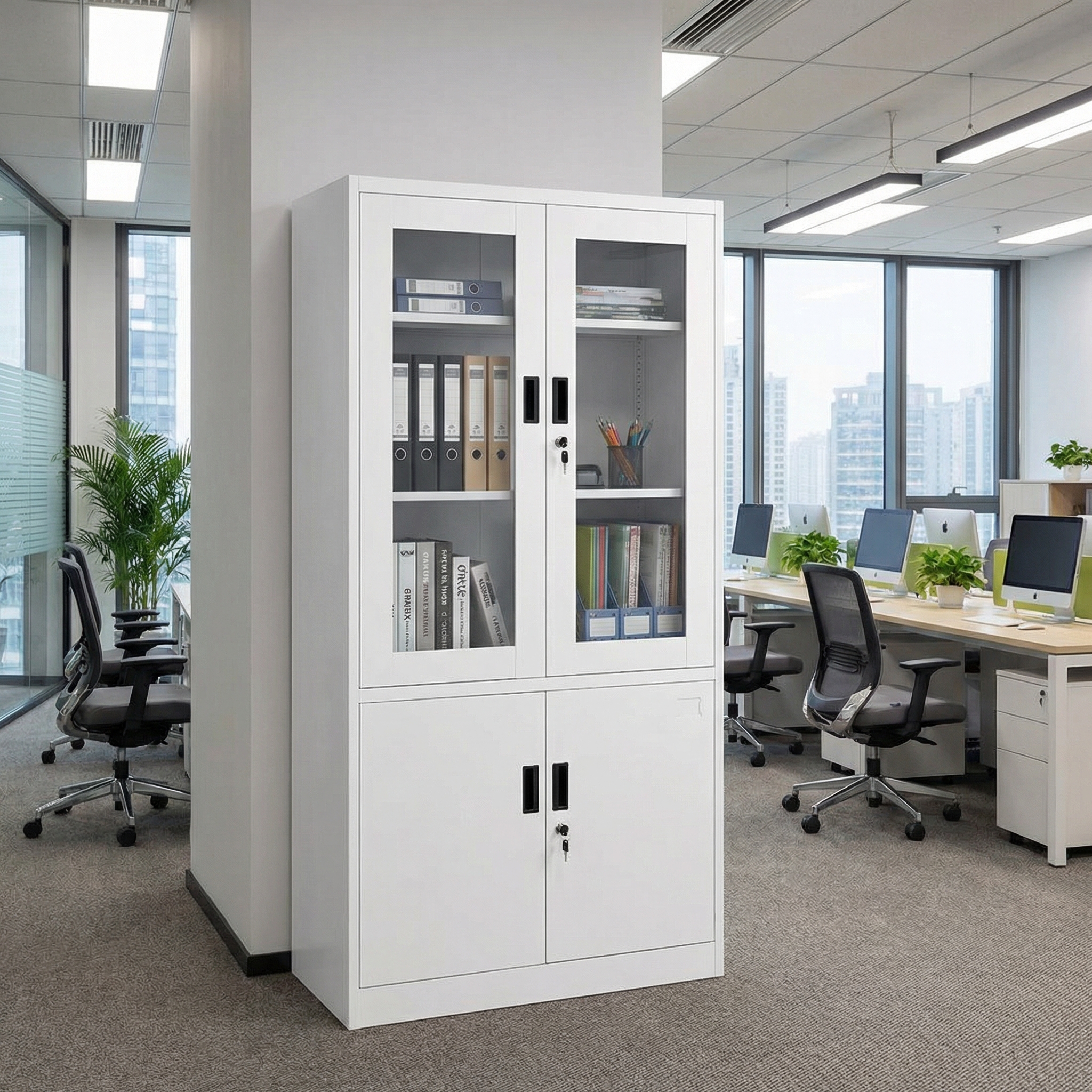 Este modelo cuenta con cuatro puertas, de las cuales las dos superiores están equipadas con vidrio que permite una vista clara del contenido. La seguridad está garantizada gracias a sus cerraduras, que incluyen dos llaves por compartimiento. Además, el estante dispone de un total de cinco niveles, proporcionando una gran capacidad de almacenamiento con bandejas de separación ajustable, adaptándose a tus necesidades de organización.